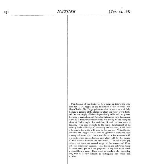 [Wild Silks of India], Peppe, T. F. Nature, Vol. 35, January 13, 1887, 1 page. CD (HWDA09). Posted June 17, 2004. SAMPLE PAGE. File size 412 KB PDF