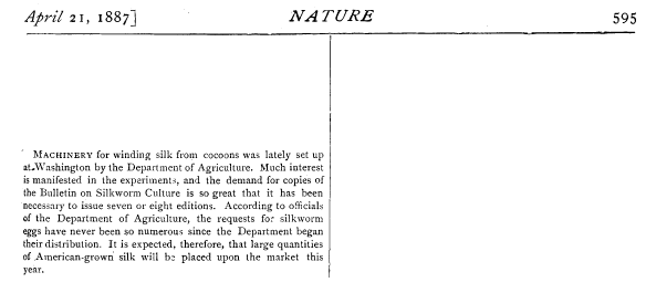 [Machinery or Winding Silk], ---. Nature, Vol. 35, April 21, 1887, 1 page. CD (HWDA09). Posted June 17, 2004. SAMPLE PAGE. File size 404 KB PDF