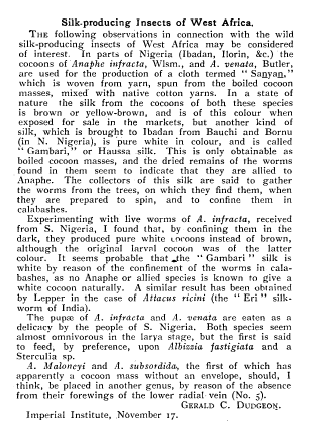 Silk-Producing Insects of West Africa, Dudgeon, Gerald C. Nature, Vol. 79, December 10, 1908, 1 page. CD (HWDA09). Posted September 28, 2003. SAMPLE PAGE. File size 424 KB PDF
