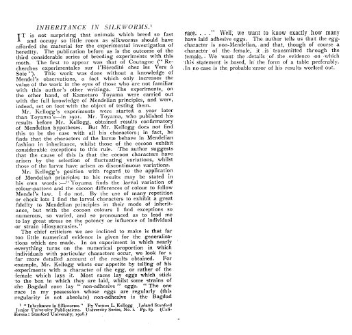 Inheritance in Silkworms, ---. Nature, Vol. 79, November 19, 1908, 1 page. CD (HWDA09). Posted September 28, 2003. SAMPLE PAGE. File size 452 KB PDF