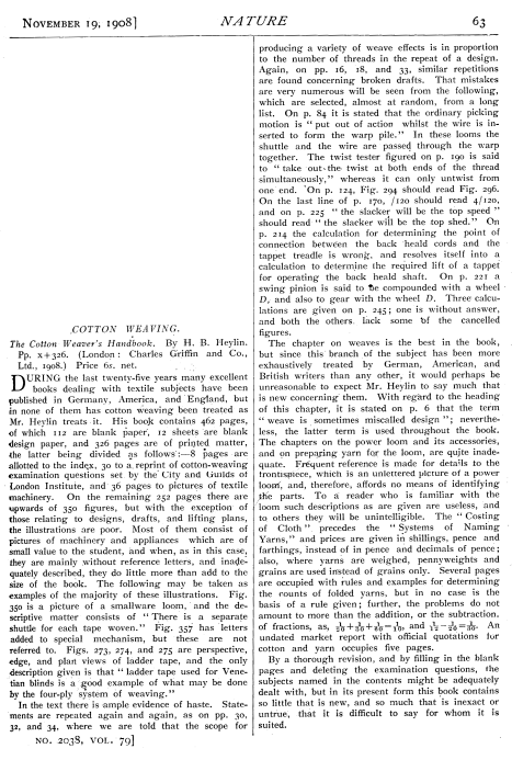 Cotton Weaver's Handbook, H. B. Heylin, ---. Nature, Vol. 79, November 19, 1908, 1 page. CD (HWDA09). Posted September 28, 2003. SAMPLE PAGE. File size 488 KB PDF