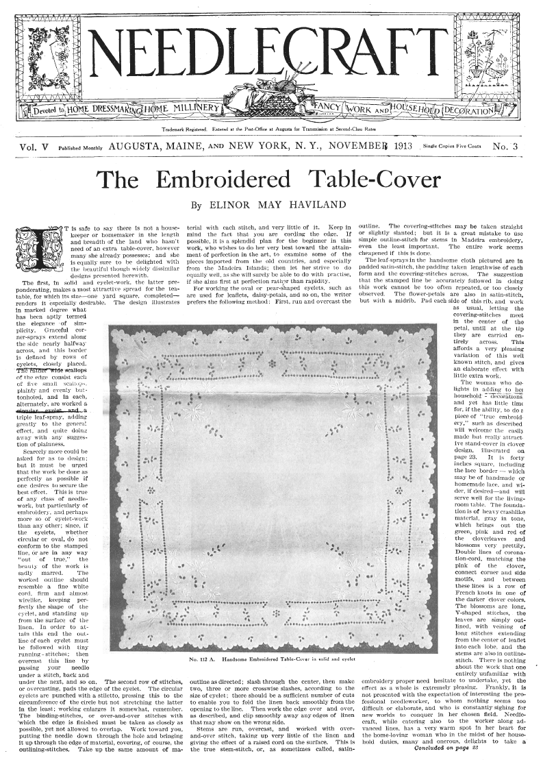 The Embroidered Table-Cover, Haviland, Elinor May. Needlecraft Magazine , November 1912, 2 pages. Note: PDF provided by Judith Combs. Posted July 7, 2006. SAMPLE PAGE. File size 2.74 MB PDF