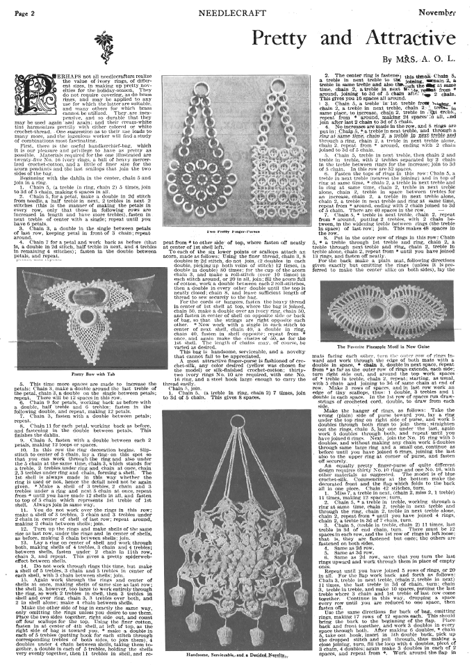 Pretty and Attractive Novelties in Crochet, Wertman, A.O. L. Needlecraft Magazine , November 1912, 2 pages. Note: PDF provided by Judith Combs. Posted July 7, 2006. SAMPLE PAGE. File size 2 MB PDF
