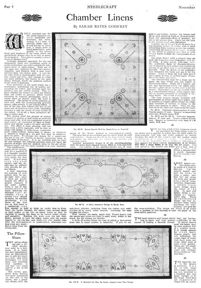 Chamber Linens, Godfrey, Sarah Bates. Needlecraft Magazine 1, November 1912, Note: PDF provided by Judith Combs. Posted July 7, 2006. SAMPLE PAGE. File size 1.62 MB PDF