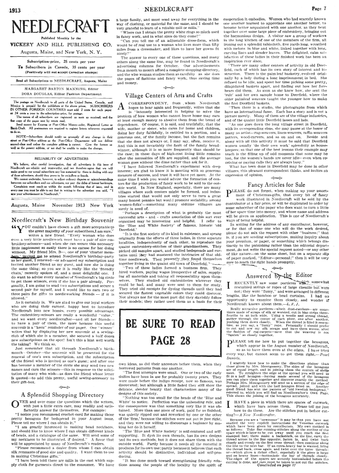 Answered by the Editor, Manning, Margaret Barton. Needlecraft, Vol. XI No. 1 (September 1919), 1 page. Note: PDF provided by Judith Comb. Posted September 3, 2006. SAMPLE PAGE. File size 585 KB PDF