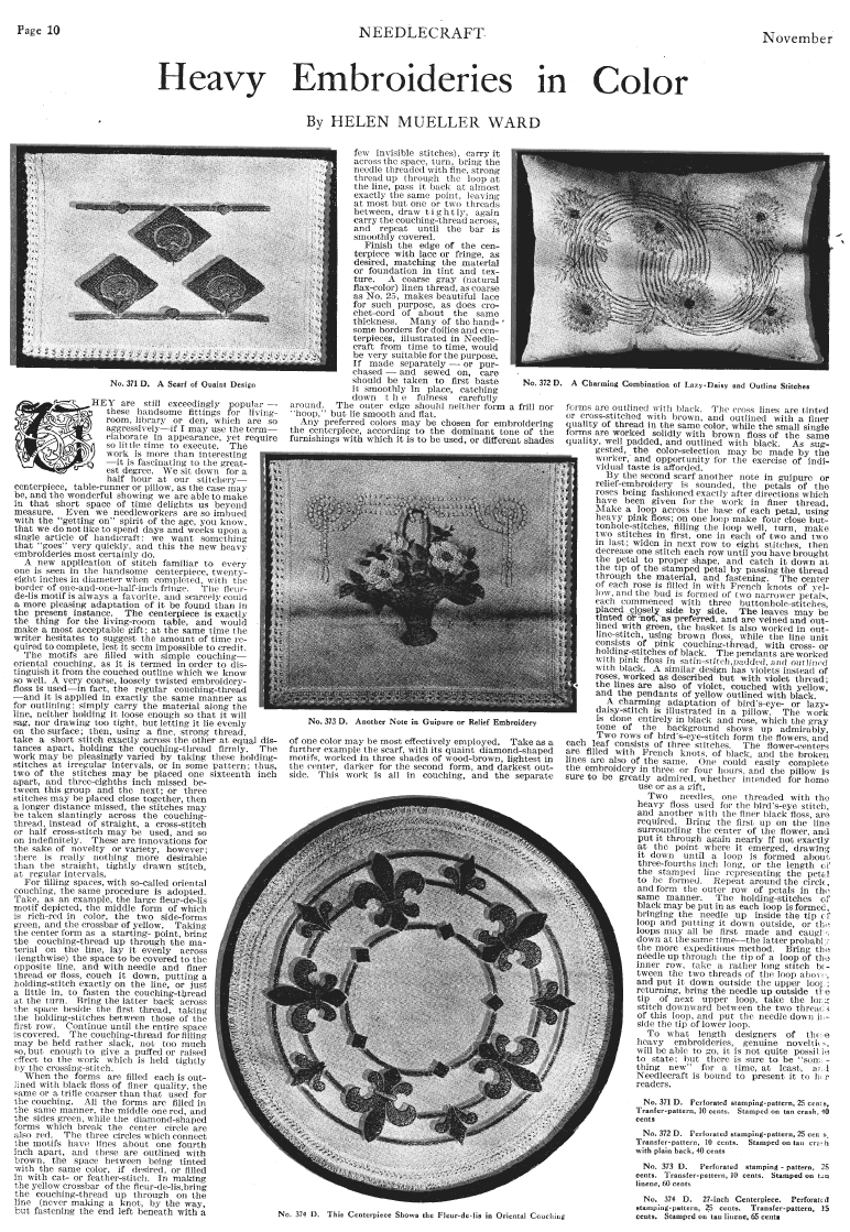 Heavy Embroideries in Color, Ward, Helen Mueller. Needlecraft Magazine , November 1912, 1 page. Note: PDF provided by Judith Combs. Posted July 7, 2006. SAMPLE PAGE. File size 1.64 MB PDF