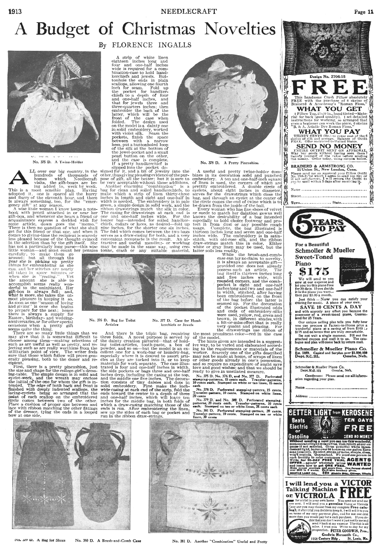 A Budget of Christmas Novelties, Ingalls, Florence. Needlecraft Magazine , November 1912, 1 page. Note: PDF provided by Judith Combs. Posted July 7, 2006. SAMPLE PAGE. File size 978 KB PDF