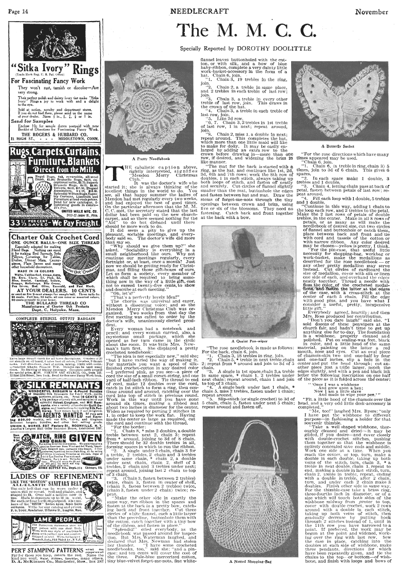 The M.M.C.C. (crocheted gifts), Doolittle, Dorothy. Needlecraft Magazine , November 1912, 2 pages. Note: PDF provided by Judith Combs. Posted July 7, 2006. SAMPLE PAGE. File size 1.70 MB PDF