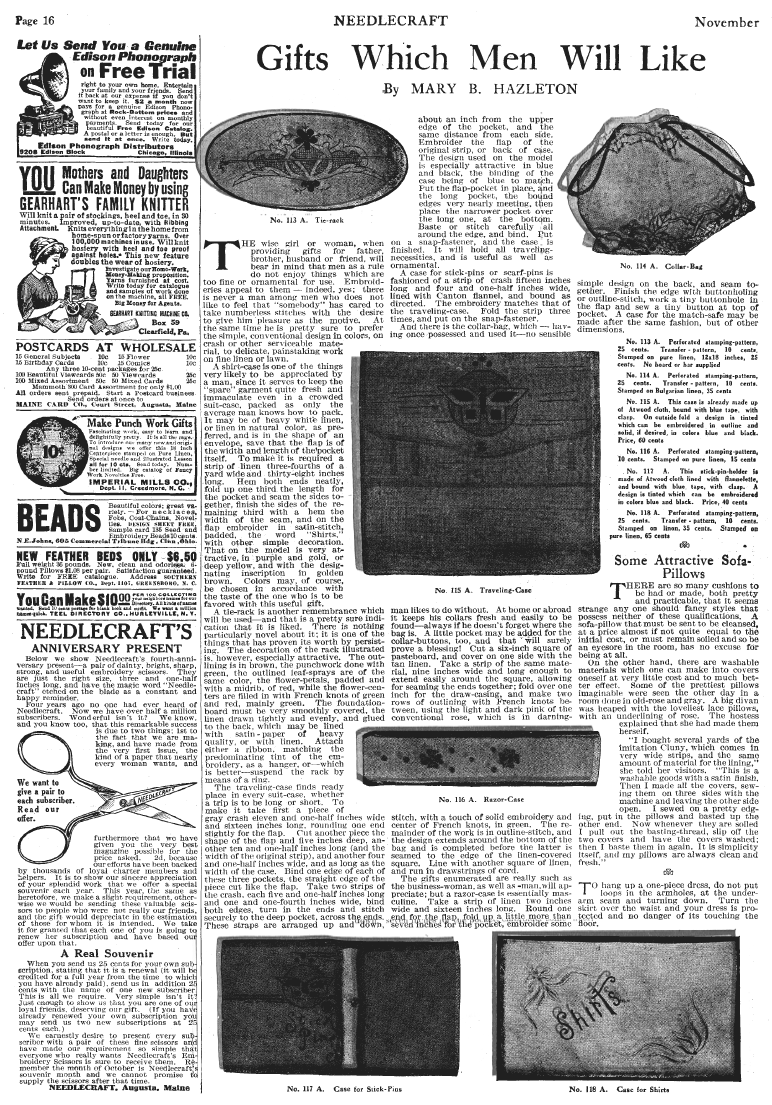 Gifts Which Men Will Like, Hazleton, Mary B. Needlecraft Magazine , November 1912, 1 page. Note: PDF provided by Judith Combs. Posted July 7, 2006. SAMPLE PAGE. File size 404 KB PDF