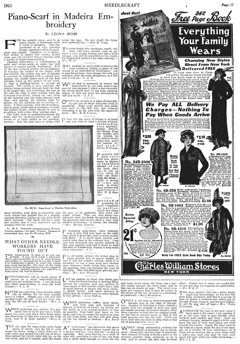 Piano-Scarf in Madeira Embroidery, Bush, Leona . Needlecraft Magazine , 1913, 1 page. Note: PDF provided by Judith Combs. Posted July 7, 2006. SAMPLE PAGE. File size 707 KB PDF
