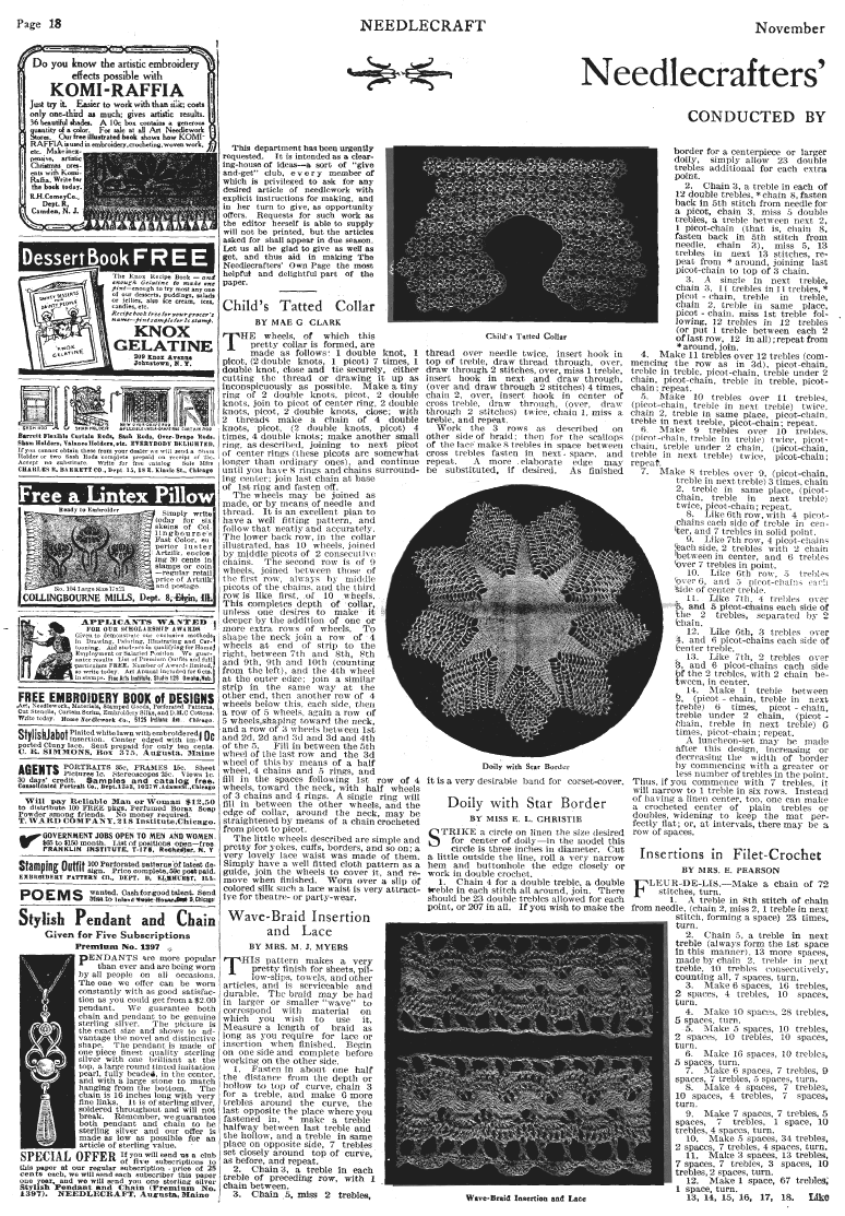 Needlecrafters Own Page [tatted and crocheted lace patterns], ---. Needlecraft Magazine , November 1912, 2 pages. Note: PDF provided by Judith Combs. Posted July 7, 2006. SAMPLE PAGE. File size 2 MB PDF