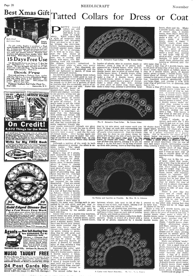 Tatted Collars for Dress or Coat, Athey, Lizzy, M, L. Johnson, and N. L. Coats,. Needlecraft Magazine , November 1912, 3 pages. Note: PDF provided by Judith Combs. Posted July 7, 2006. SAMPLE PAGE. File size 2.54 MB PDF