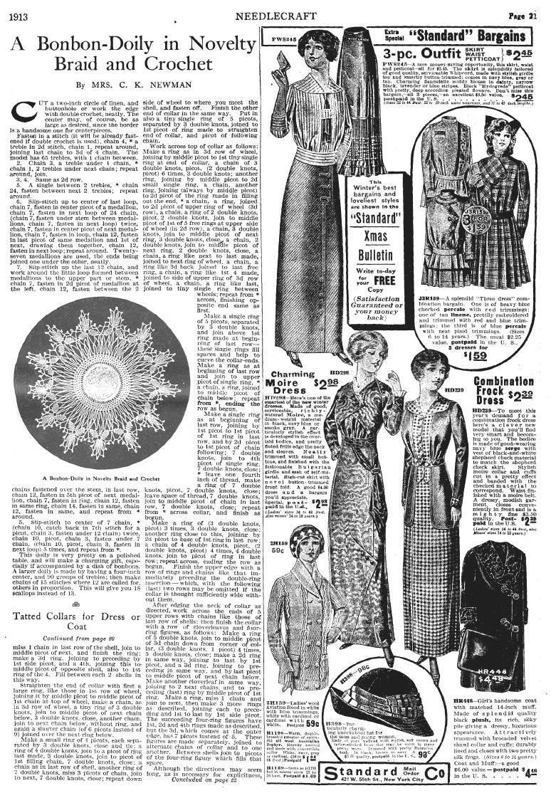 A Bon-Bon Doily in Novelty Braid and Crochet, Newman, C. K. Needlecraft Magazine , November 1912, 2 pages. Note: PDF provided by Judith Combs. Posted July 7, 2006. SAMPLE PAGE. File size 1.67 MB PDF