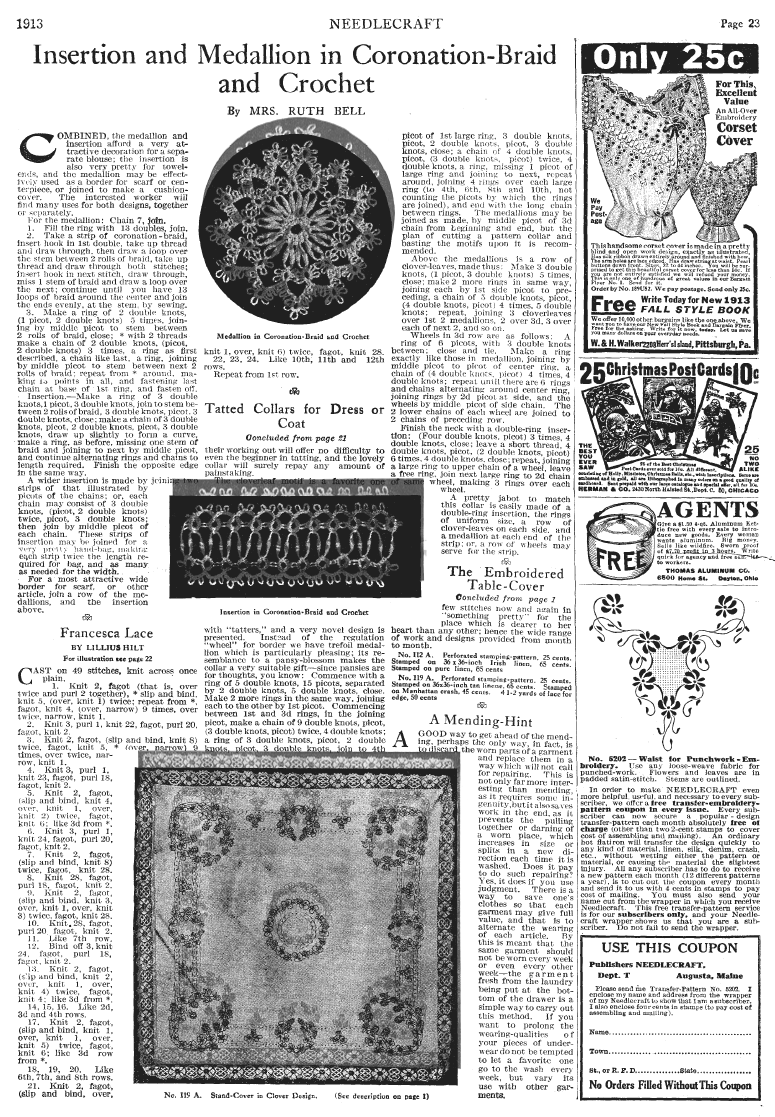 Insertion and Medallion in Coronation-Braid and Crochet, Bell, Ruth. Needlecraft Magazine , November 1912, 1 page. Note: PDF provided by Judith Combs. Posted July 7, 2006. SAMPLE PAGE. File size 1 MB PDF