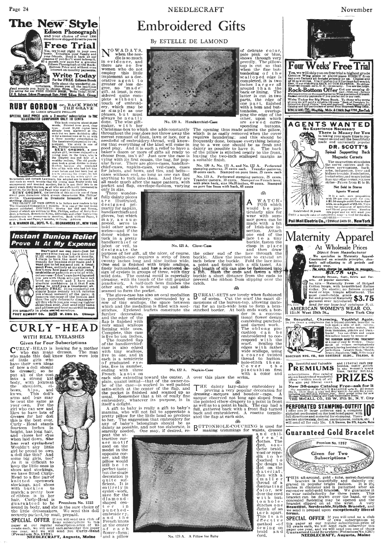 Embroidered Gifts, de Lamond, Estelle. Needlecraft Magazine , November 1912, 1 page. Note: PDF provided by Judith Combs. Posted July 7, 2006. SAMPLE PAGE. File size 858 KB PDF