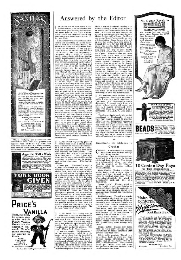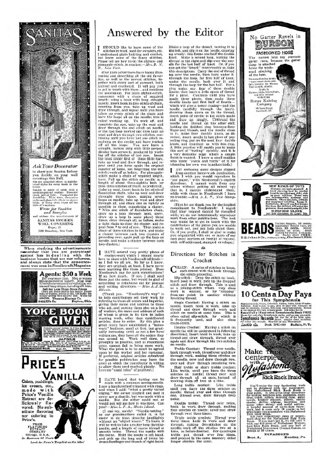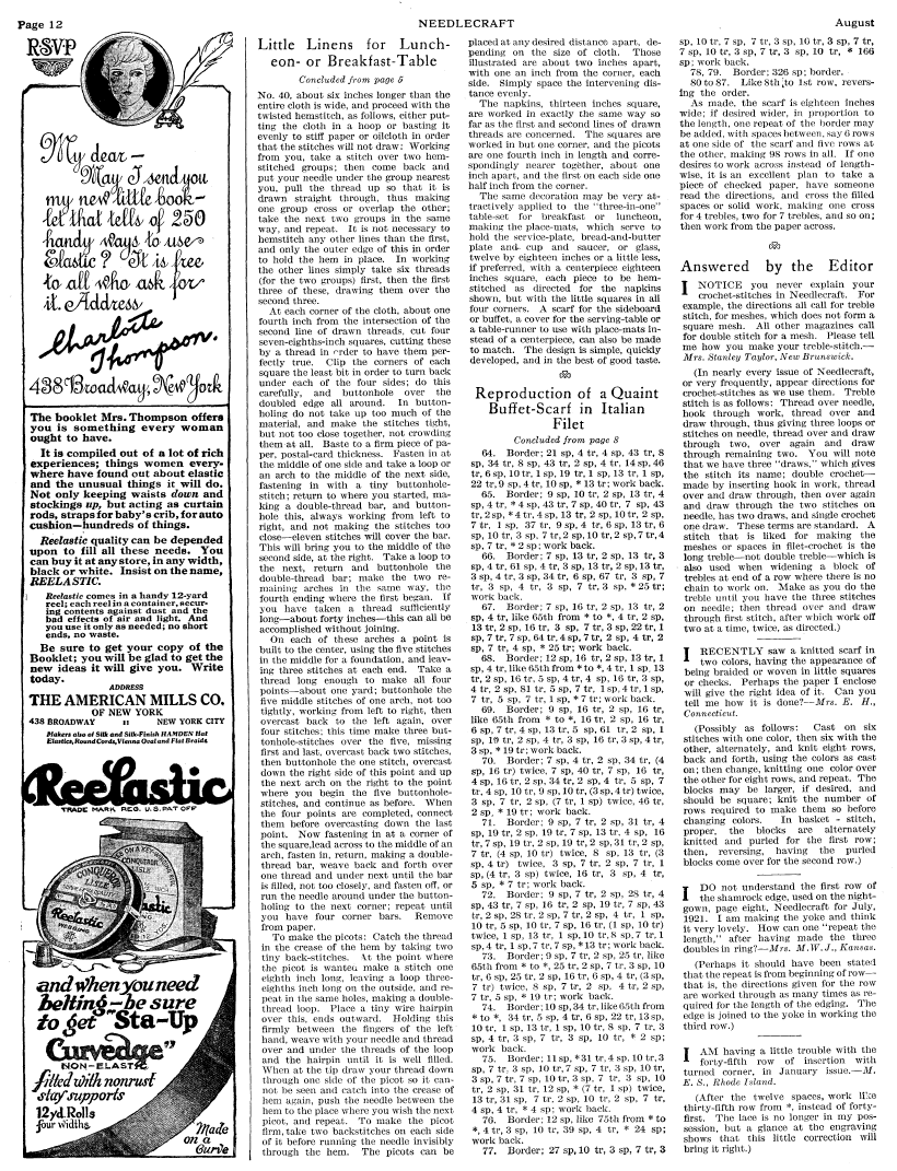 Answered by the Editor, ---. Needlecraft Magazine , Vol. XIII No. 12, August 1922, 1 page. Note: PDF provided by Judith Combs. Posted July 7, 2006. SAMPLE PAGE. File size 796 KB PDF