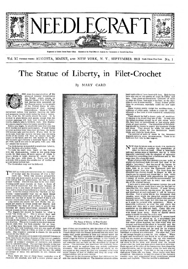 The Statue of Liberty, in Filet-Crochet, Card, Mary. Needlecraft, Vol. XI No. 1 (September 1919), 1 page. Note: PDF provided by Judith Comb. Posted September 3, 2006. SAMPLE PAGE. File size 634 KB PDF