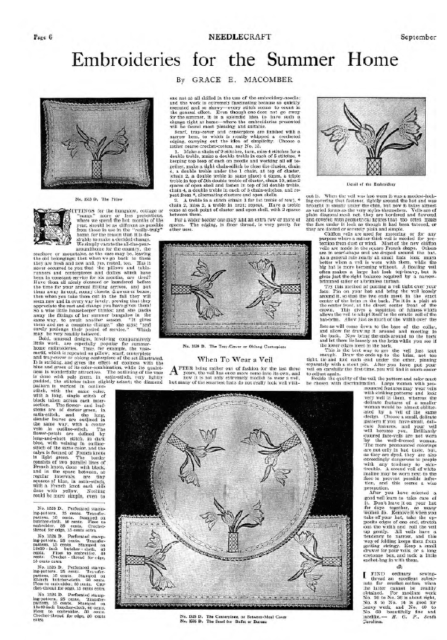 Embroideries for the Summer Home, Macomber, Grace. Needlecraft, Vol. XI No. 1 (September 1919), 1 page. Note: PDF provided by Judith Comb. Posted September 3, 2006. SAMPLE PAGE. File size 638 KB PDF