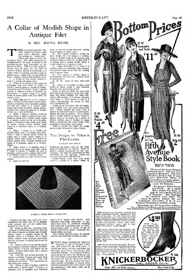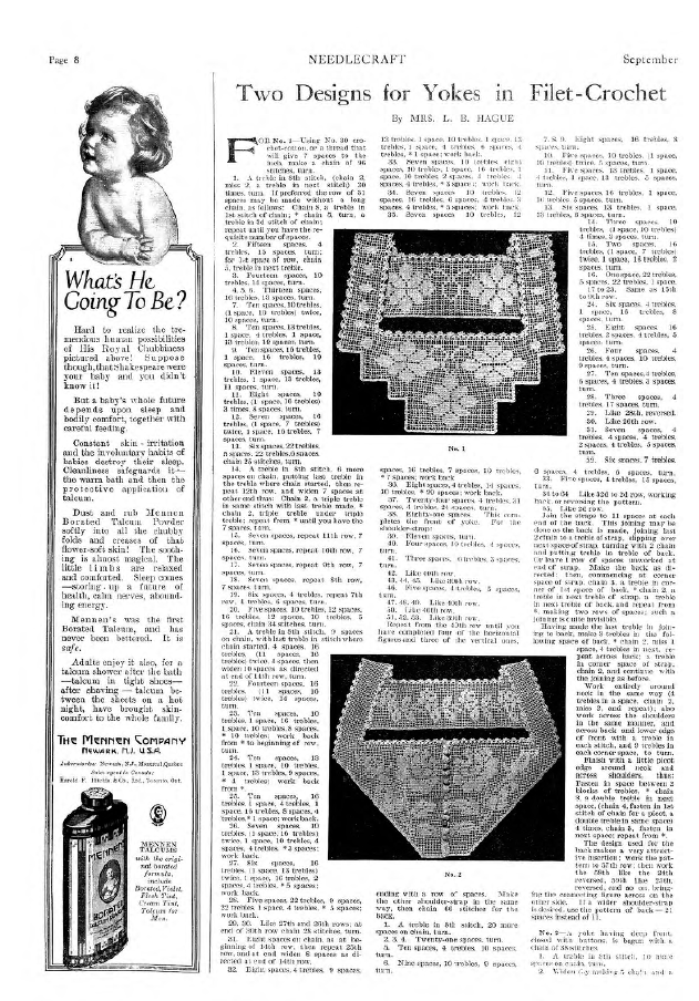 Two Designs for Yokes in Filet-Crochet, Hague, Mrs. L.B. Needlecraft, Vol. XI No. 1 (September 1919), 3 pages. Note: PDF provided by Judith Comb. Posted September 3, 2006. SAMPLE PAGE. File size 1.7 MB PDF