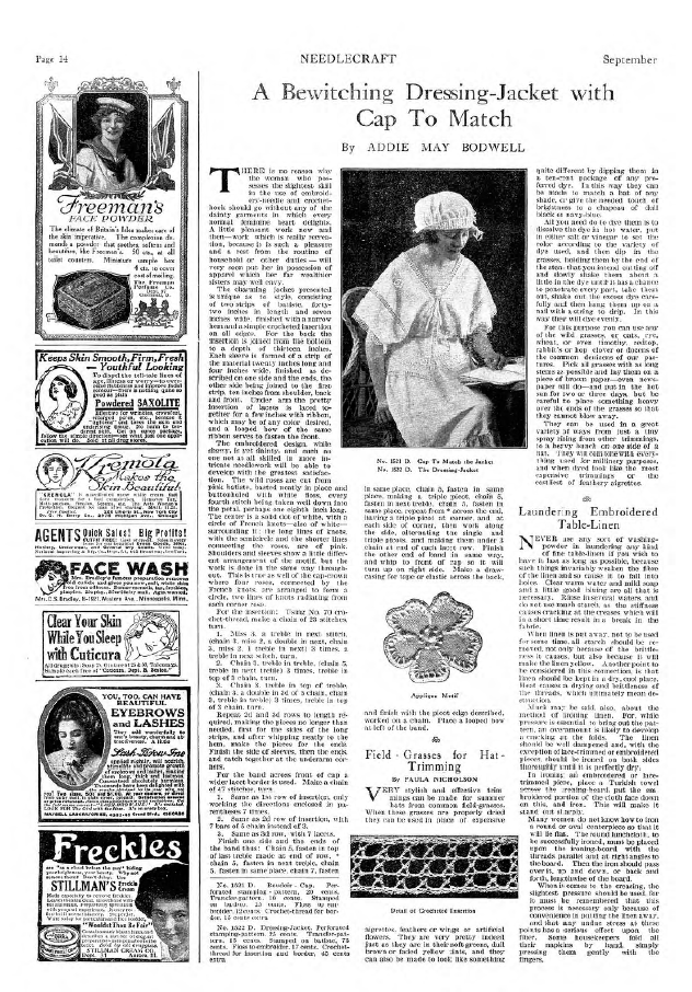 A Bewitching Dressing-Jacket with Cap to Match, Bowel, Adieu May. Needlecraft, Vol. XI No. 1 (September 1919), 1 page. Note: PDF provided by Judith Comb. Posted September 3, 2006. SAMPLE PAGE. File size 530 KB PDF