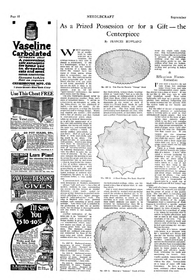 As a Prized Possession or for a Gift - the Centerpiece, Holland, Frances. Needlecraft, Vol. XI No. 1 (September 1919), 1 page. Note: PDF provided by Judith Comb. Posted September 3, 2006. SAMPLE PAGE. File size 461 KB PDF