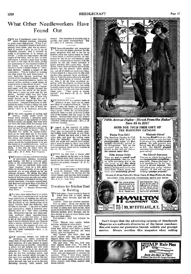 What Other Needleworkers Have Found Out, ---. Needlecraft, Vol. XI No. 1 (September 1919), 1 page. Note: PDF provided by Judith Comb. Posted September 3, 2006. SAMPLE PAGE. File size 535 KB PDF