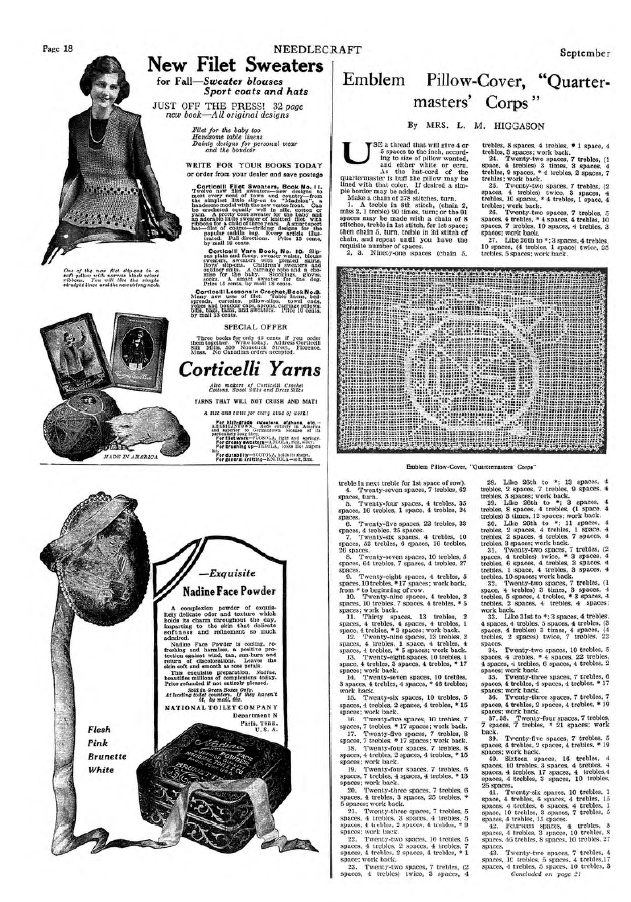 Emblem Pillow-Cover, Quartermasters' Corps, Higgason, Mrs. L.M. Needlecraft, Vol. XI No. 1 (September 1919), 2 pages. Note: PDF provided by Judith Comb. Posted September 3, 2006. SAMPLE PAGE. File size 939 KB PDF