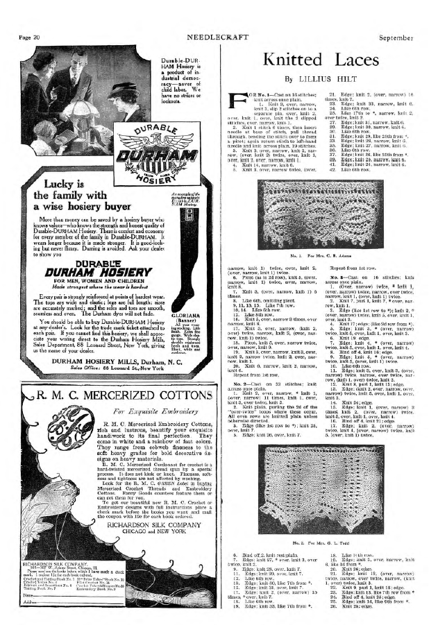 Knitted Laces, Hilt, Lillius. Needlecraft, Vol. XI No. 1 (September 1919), 2 pages. Note: PDF provided by Judith Comb. Posted September 3, 2006. SAMPLE PAGE. File size 917 Kb PDF