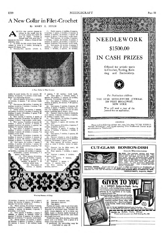 A New Collar in Filet-Crochet, Fitch, Mary E. Needlecraft, Vol. XI No. 1 (September 1919), 2 pages. Note: PDF provided by Judith Comb. Posted September 3, 2006. SAMPLE PAGE. File size 1 MB PDF