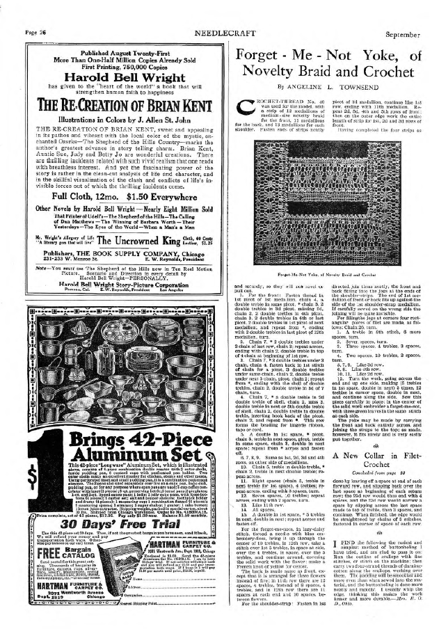Forget-Me-Not Yoke, of Novelty Braid and Crochet, Townsend, Angeline L. Needlecraft, Vol. XI No. 1 (September 1919), 1 page. Note: PDF provided by Judith Combs. Posted September 3, 2006. SAMPLE PAGE. File size 541 KB PDF