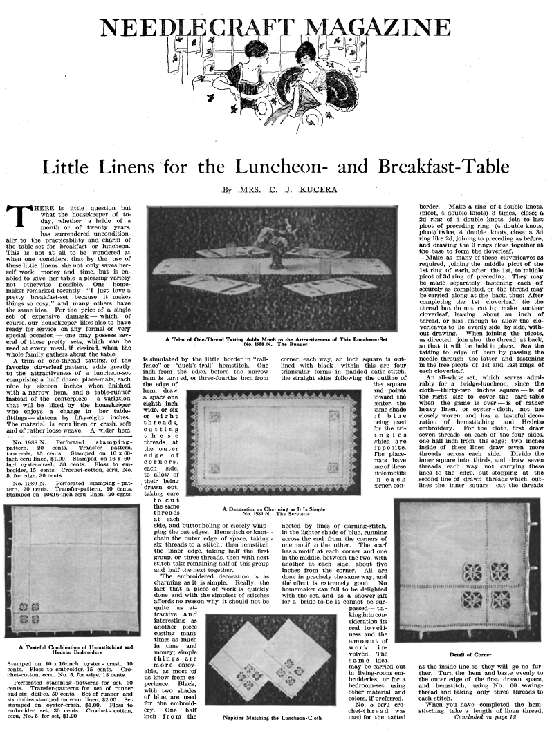 Little Linens For The Luncheon And Breakfast Table, Kucera, C. J. Needlecraft Magazine , Vol. XIII No. 12, August 1922, 2 pages. Note: PDF provided by Judith Combs. Posted July 7, 2006. SAMPLE PAGE. File size 1.13 MB PDF
