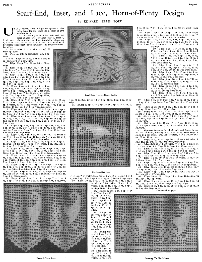 Scarf-End, Inset and Lace, Horn-of-Plenty Design, Ford, Edward Ellis. Needlecraft Magazine , Vol. XIII No. 12, August 1922, 3 pages. Note: PDF provided by Judith Combs. Posted July 7, 2006. SAMPLE PAGE. File size 1.44 MB PDF
