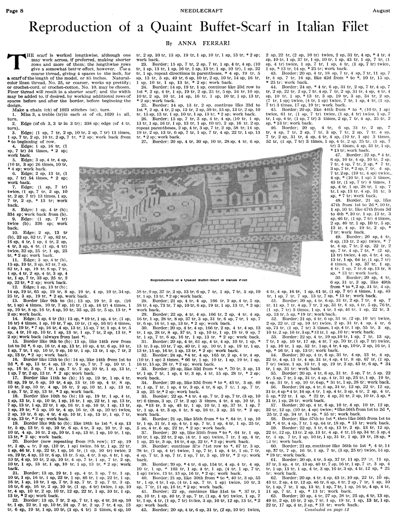 Reproduction Of A Quaint Buffet-Scarf in Italian Filet, Ferrari, Anna. Needlecraft Magazine , Vol. XIII No. 12, August 1922, 2 pages. Note: PDF provided by Judith Combs. Posted July 7, 2006. SAMPLE PAGE. File size 1 MB PDF