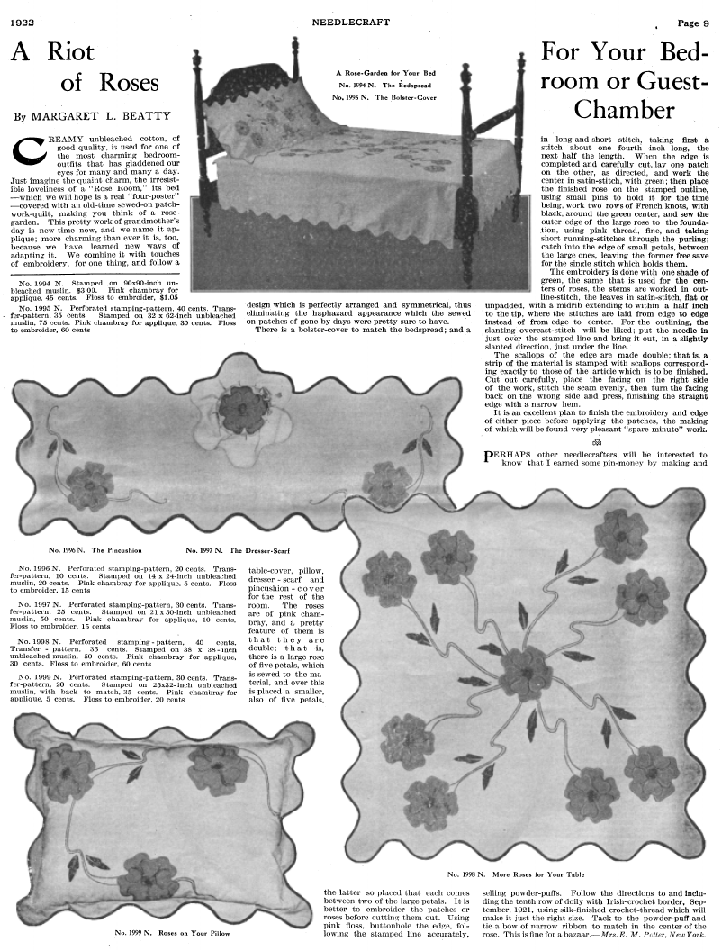 A Riot Of Roses For Your Bed-Room Or Guest Chamber, Beatty, Margaret L. Needlecraft Magazine , Vol. XIII No. 12, August 1922, 1 page. Note: PDF provided by Judith Combs. Posted July 7, 2006. SAMPLE PAGE. File size 755 KB PDF