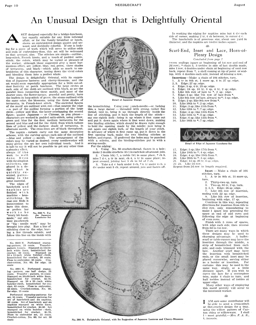 An Unusual Design that is Delightfully Oriental, ---. Needlecraft Magazine , Vol. XIII No. 12, August 1922, 1 page. Note: PDF provided by Judith Combs. Posted July 7, 2006. SAMPLE PAGE. File size 728 KB PDF
