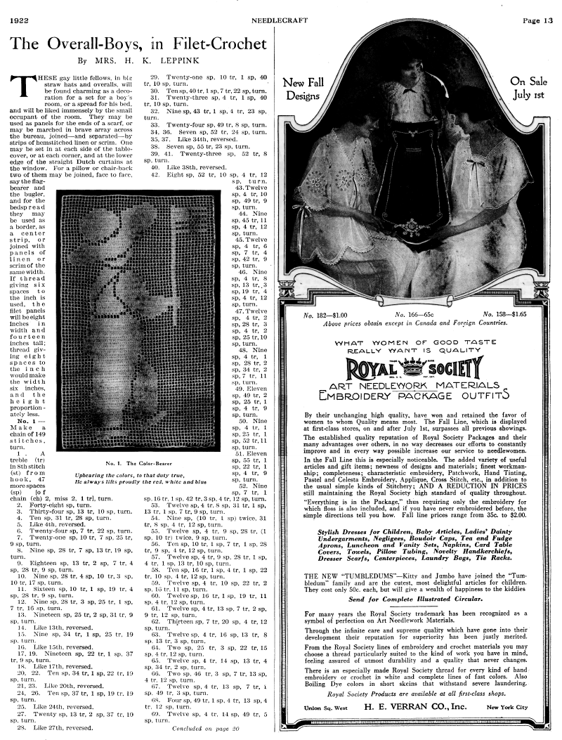 The Overall Boys, In Filet Crochet , Leppink, H. K. Needlecraft Magazine , Vol. XIII No. 12, August 1922, 2 pages. Note: PDF provided by Judith Combs. Posted July 7, 2006. SAMPLE PAGE. File size 1.49 MB PDF