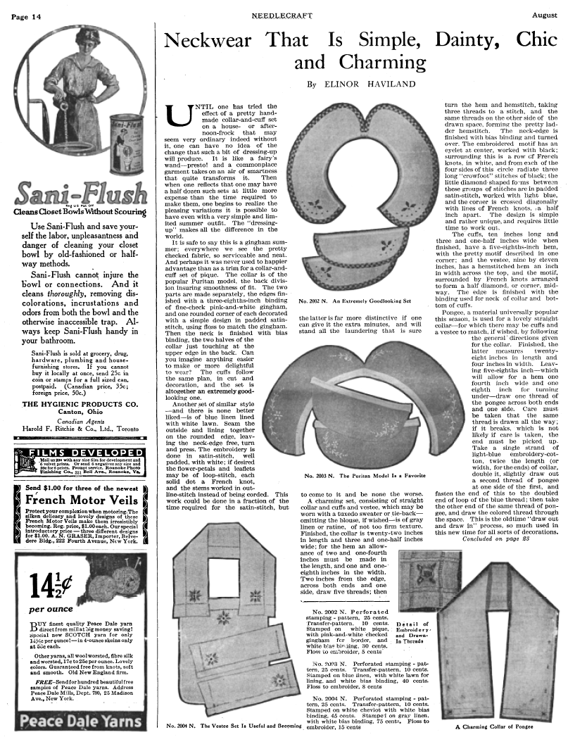 Neckwear That Is Simple, Dainty, Chic and Charming, Haviland, Elinor. Needlecraft Magazine , Vol. XIII No. 12, August 1922, 2 pages. Note: PDF provided by Judith Combs. Posted July 7, 2006. SAMPLE PAGE. File size 1 MB PDF