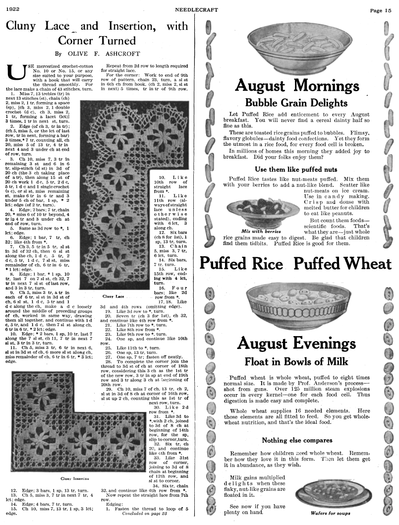 Cluny Lace and Insertion, with Corner Turned, Ashcroft, Olive F. Needlecraft Magazine , Vol. XIII No. 12, August 1922, 2 pages. Note: PDF provided by Judith Combs. Posted July 7, 2006. SAMPLE PAGE. File size 1 MB PDF