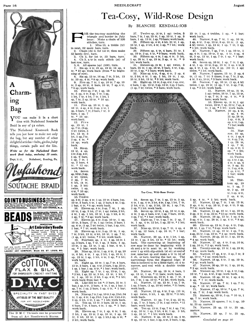 Tea-Cosy, Wild-Rose Design, Kendall-Job, Blanche. Needlecraft Magazine , Vol. XIII No. 12, August 1922, 2 pages. Note: PDF provided by Judith Combs. Posted July 7, 2006. SAMPLE PAGE. File size 1 MB PDF