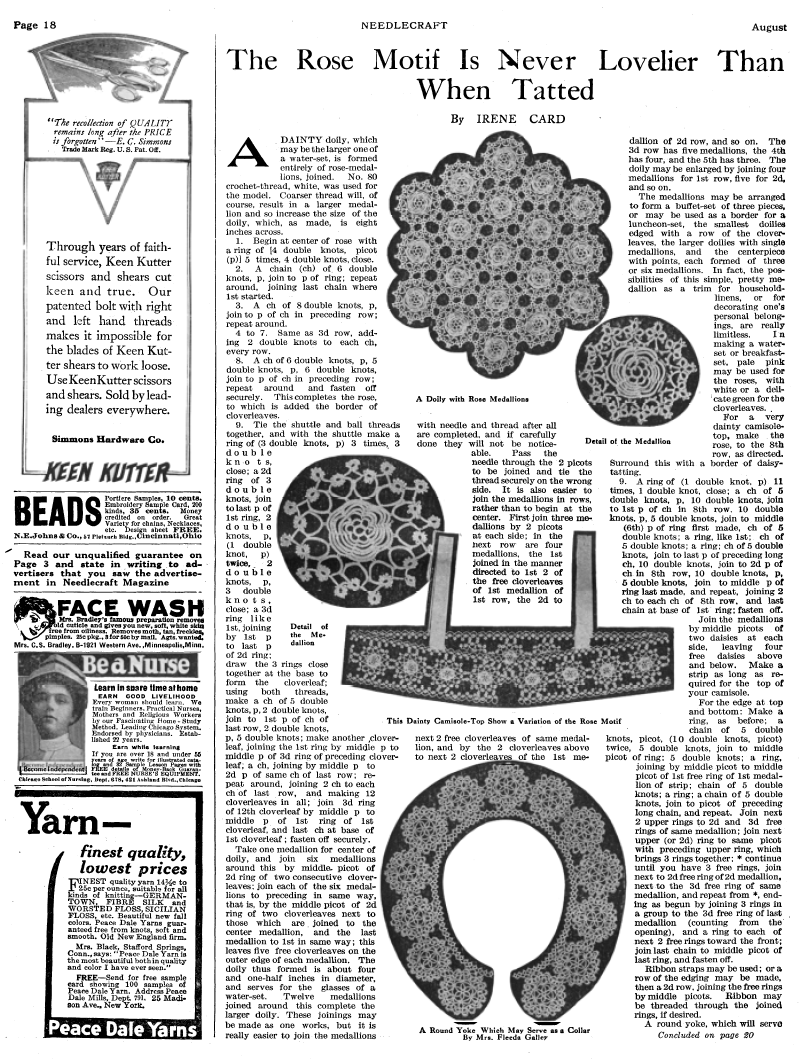 The Rose Motif Is Never Lovelier Than When Tatted, Card, Irene. Needlecraft Magazine , Vol. XIII No. 12, August 1922, 2 pages. Note: PDF provided by Judith Combs. Posted July 7, 2006. SAMPLE PAGE. File size 1 MB PDF