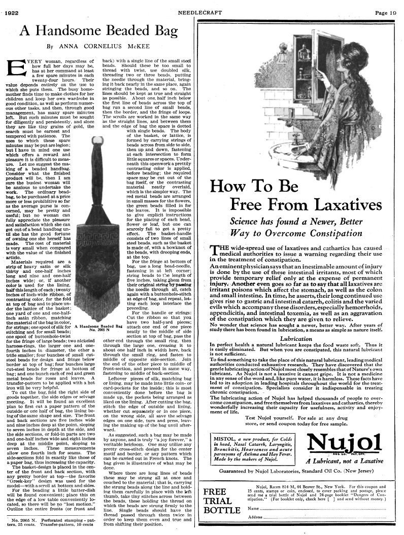 A Handsome Beaded Bag, McKee, Anna Cornelius. Needlecraft Magazine , Vol. XIII No. 12, August 1922, 1 page. Note: PDF provided by Judith Combs. Posted July 7, 2006. SAMPLE PAGE. File size 681 KB PDF