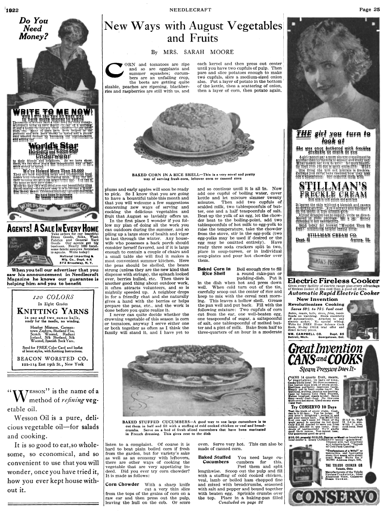 New Ways With August Vegetables And Fruit, Moore, Sarah. Needlecraft Magazine , Vol. XIII No. 12, August 1922, 2 pages. Note: PDF provided by Judith Combs. Posted July 7, 2006. SAMPLE PAGE. File size 1.19 MB PDF