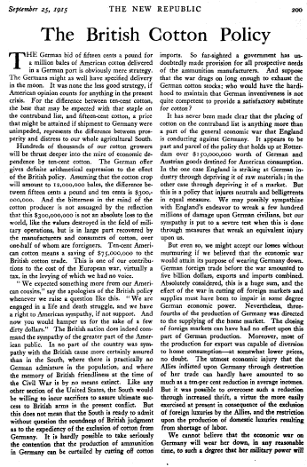 The British Cotton Policy, ---. New Republic, September 25, 1915, 2 pages. Note: Image reduced 85% to fit page. Posted April 20, 2006. SAMPLE PAGE. File size 184 KB PDF