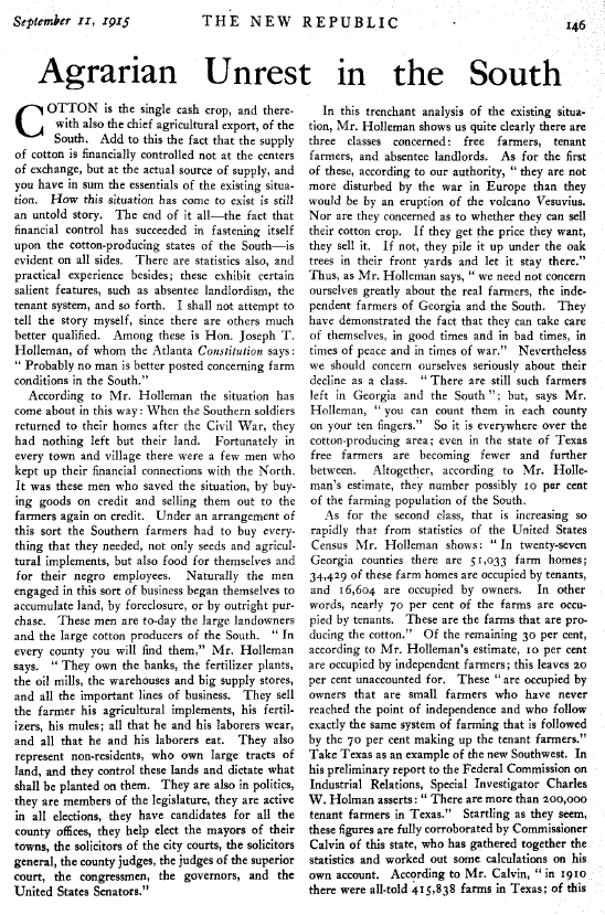 Agrarian Unrest in the South, ---. New Republic, September 11, 1915, 3 pages. Note: Image reduced 85% to fit page. Posted April 20, 2006. SAMPLE PAGE. File size 284 KB PDF