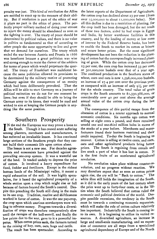 Southern Prosperity, ---. New Republic, December 25, 1915, 2 pages. Note: Image reduced 85% to fit page. Posted April 20, 2006. SAMPLE PAGE. File size 220 KB PDF