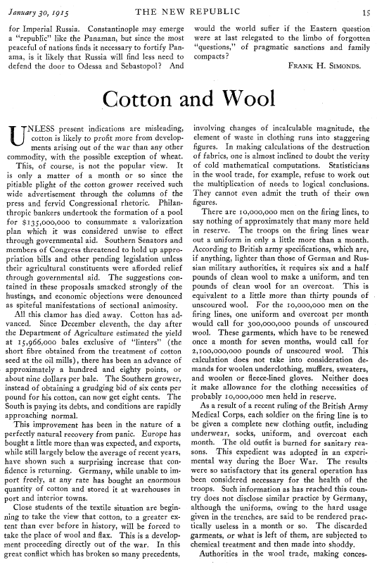 Cotton and Wool, ---. New Republic, January 30, 1915, 2 pages. Note: Image reduced 85% to fit page. Posted April 20, 2006. SAMPLE PAGE. File size 264 KB PDF