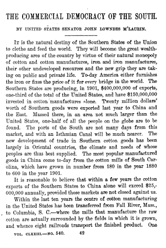 Commercial Democracy of the South, McLaurin, John Lowndes. North American Review, Vol. 173 (1901), 6 pages. CD (HWDA09). Posted September 13, 2003. SAMPLE PAGE. File size 728 KB PDF