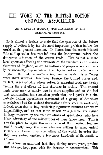 Work of the British Cotton-Growing Association, Hutton, J. Arthur. North American Review, Vol. 178 (1904), 9 pages. CD (HWDA09). Posted September 13, 2003. SAMPLE PAGE. File size 904 KB PDF