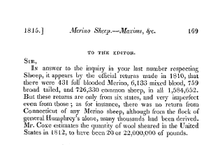 [Merino Sheep], ---. North American Review, 1815, 1 page. CD (HWDA11). Posted November 3, 2004. SAMPLE PAGE. File size 424 KB PDF
