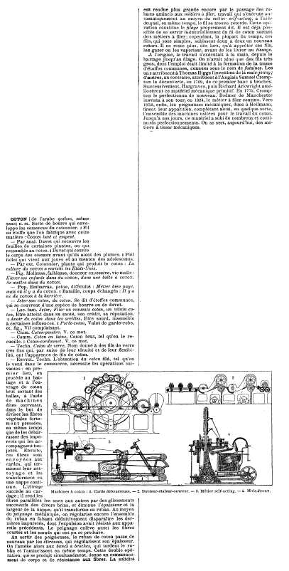 Coton [Cotton], ---. Nouveau Larousse Illustré, 1904, 1 page. Posted August 19, 2003. SAMPLE PAGE. File size 508 KB PDF